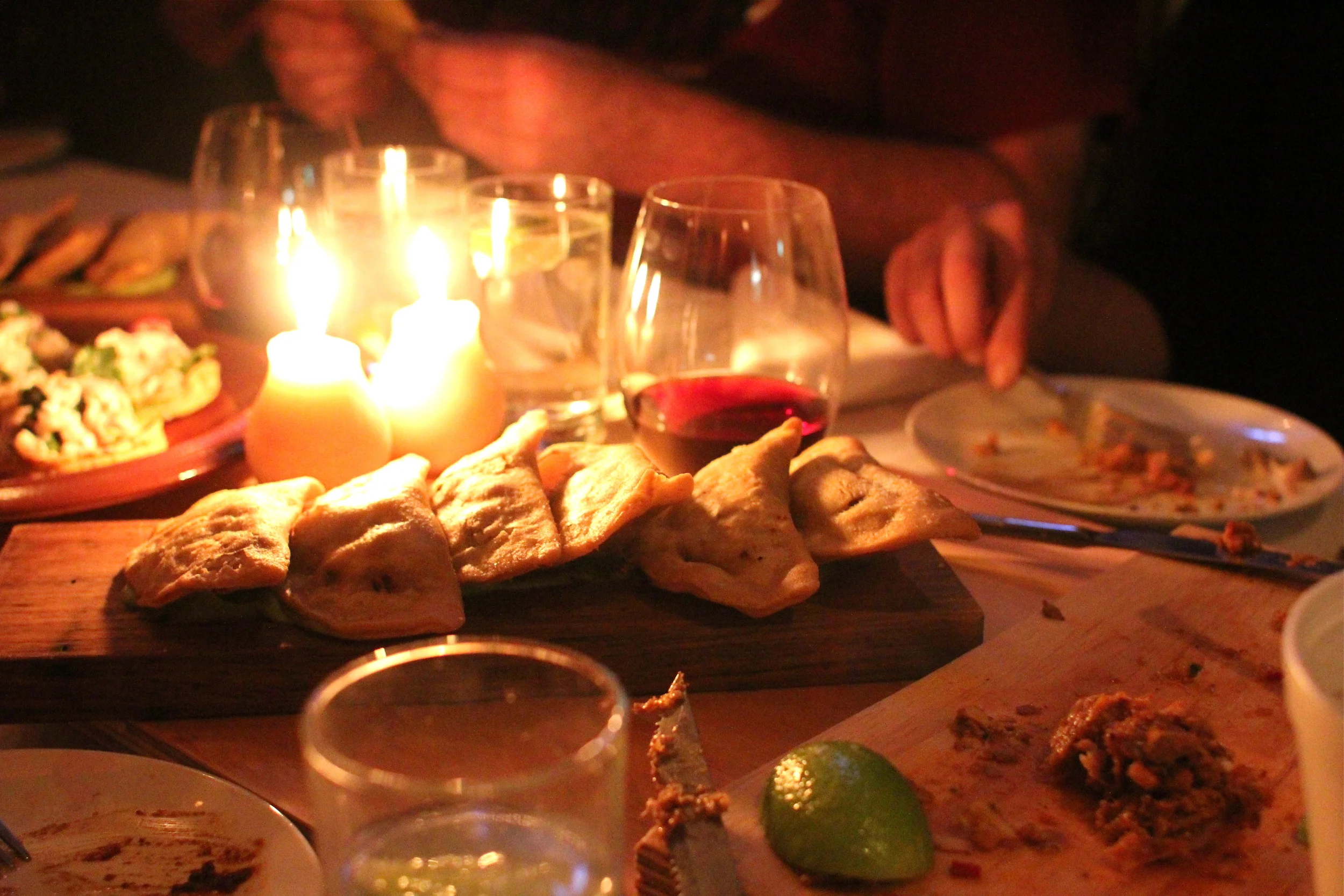 The long tables encouraged interaction with strangers soon to be friends. The walls glowed, awash with red light, brooding candles flickered to the sounds of a familiar bango rift, all lending to the mood with nervous giggles dotting the air. The tables were styled simply with white linen and long boards placed down their length, providing the perfect canvas for the myriad of colours and tastes to follow.